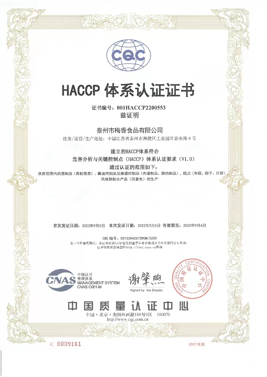 食品安全管理體系認(rèn)證(2022年9月5日至2025年9月4日)